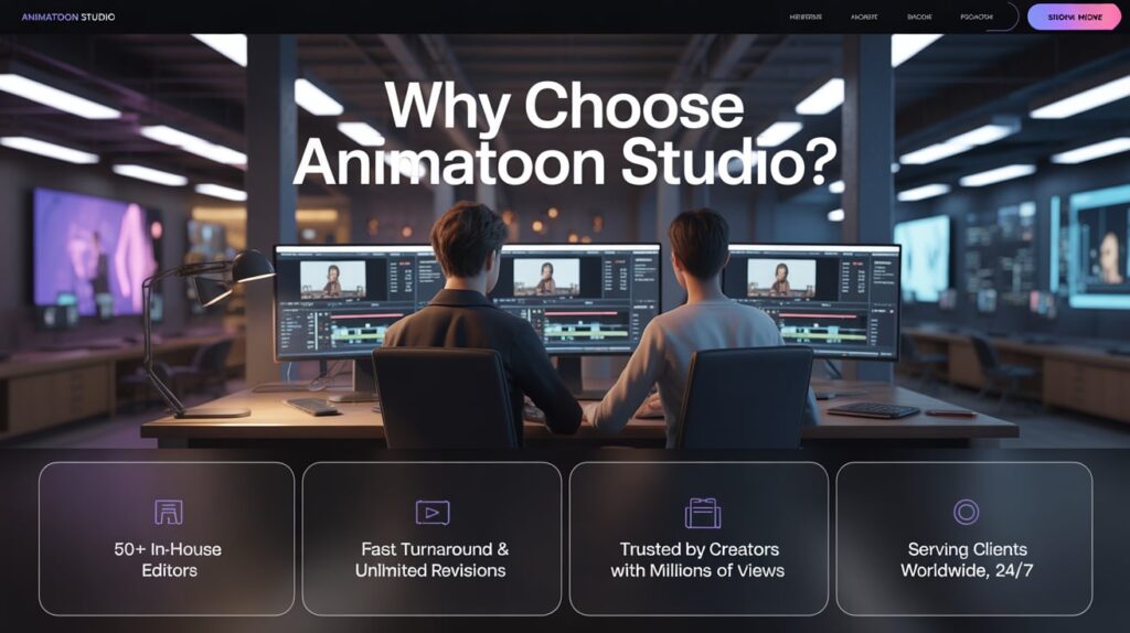 Animatoon Studio is a full-service digital creative agency that transforms ideas into cinematic experiences. Our team of top-level, seasoned editors blends narrative-driven storytelling with frame-by-frame finesseâusing industry tools like Adobe Premiere Pro, After Effects and Photoshopâto craft attention-grabbing YouTube edits, compelling documentaries, and polished branded videos. We combine meticulous color grading, seamless motion design, and strategic pacing to elevate your message and keep audiences hooked. We proudly handle creators with millions of views on their YouTube channels, delivering studio-grade pipelines, reliable turnarounds, and a collaborative process that respects your vision while adding professional creative muscle. Whether you need viral-ready content or a deeply human documentary, Animatoon Studio turns imagination into realityâbeautifully, efficiently, and with measurable impact. Let’s bring your story to life.